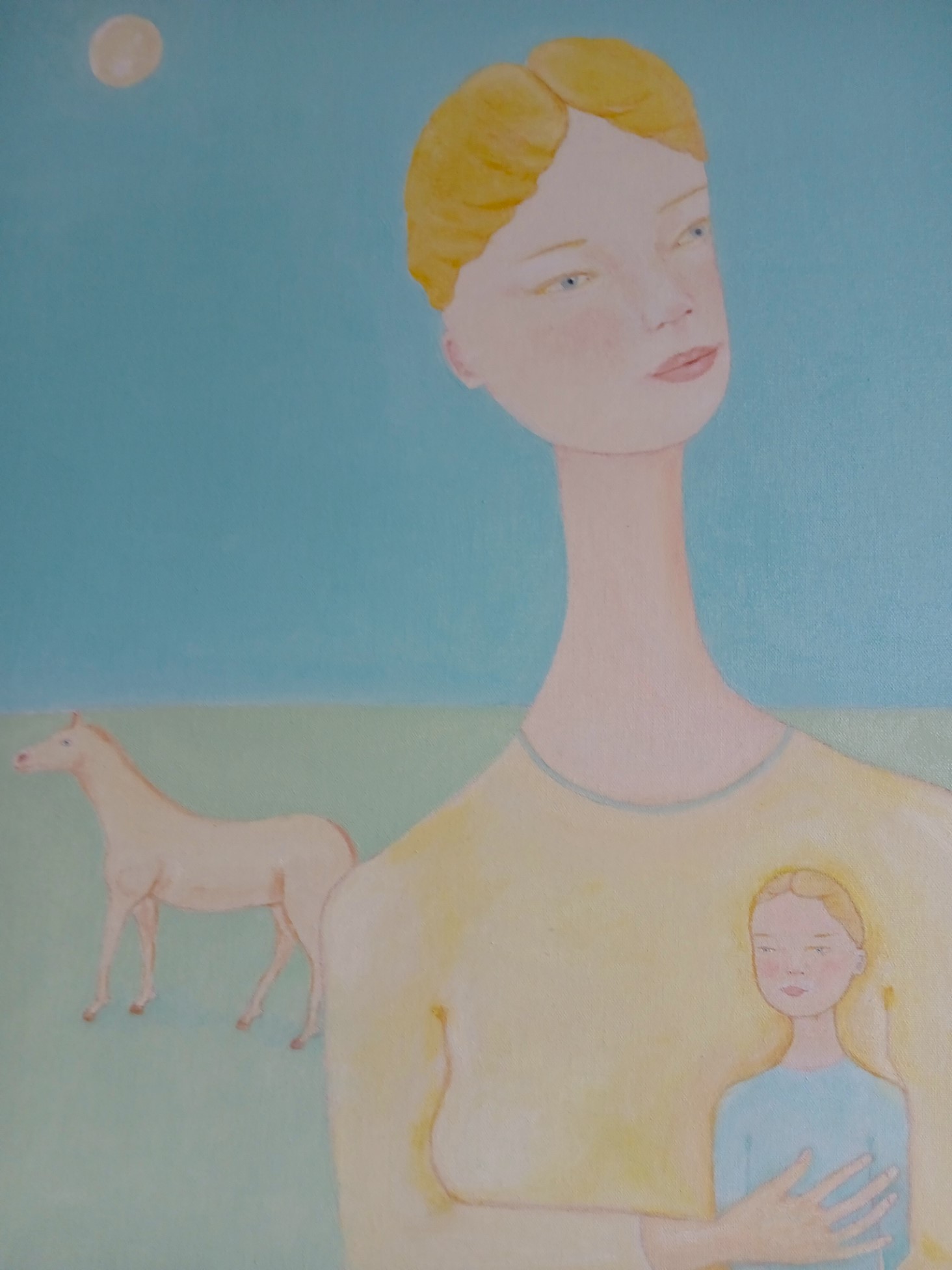 L'opera descrive un aspetto di un mondo nuovo creato da esseri femminili, libere e senza la violenza e il male prodotti solitamente dagli esseri maschili, senza essere soggiogate a quelli. La scena che è data da una mamma bellissima che tiene appresso a sé la sua bimba e un cavallo bianco libero è nella lontananza.