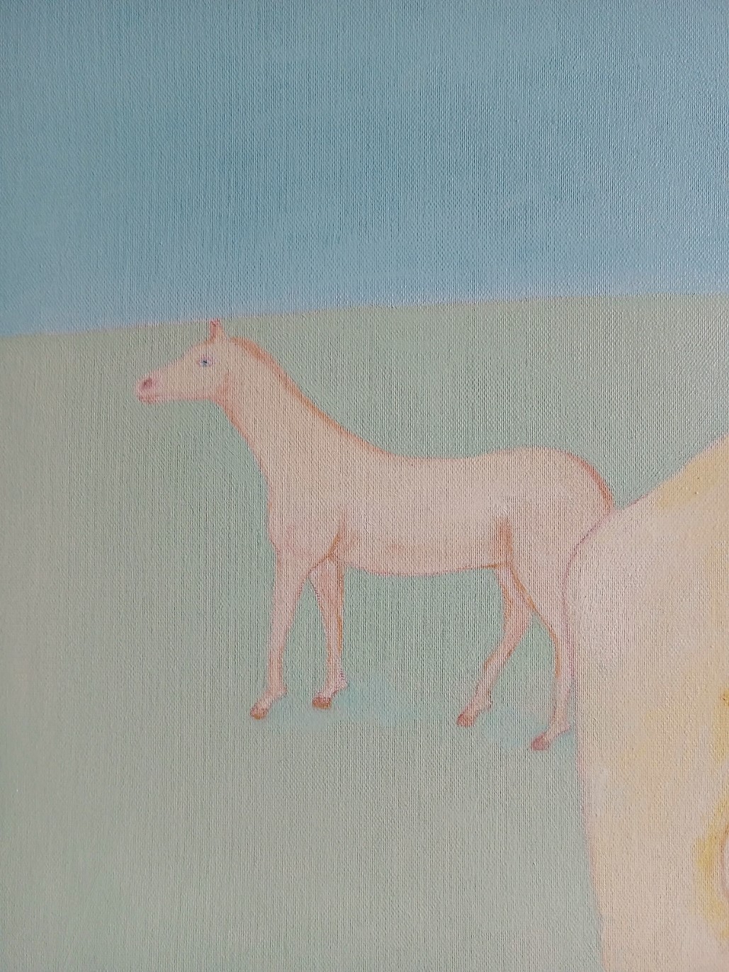 The work depicts an aspect of a new world created by female beings, free and without the violence and evil usually produced by male beings, without being subjugated to them. The scene that we see is represented by a beautiful mother holding her little girl close to her, and a white horse roaming freely in the distance.